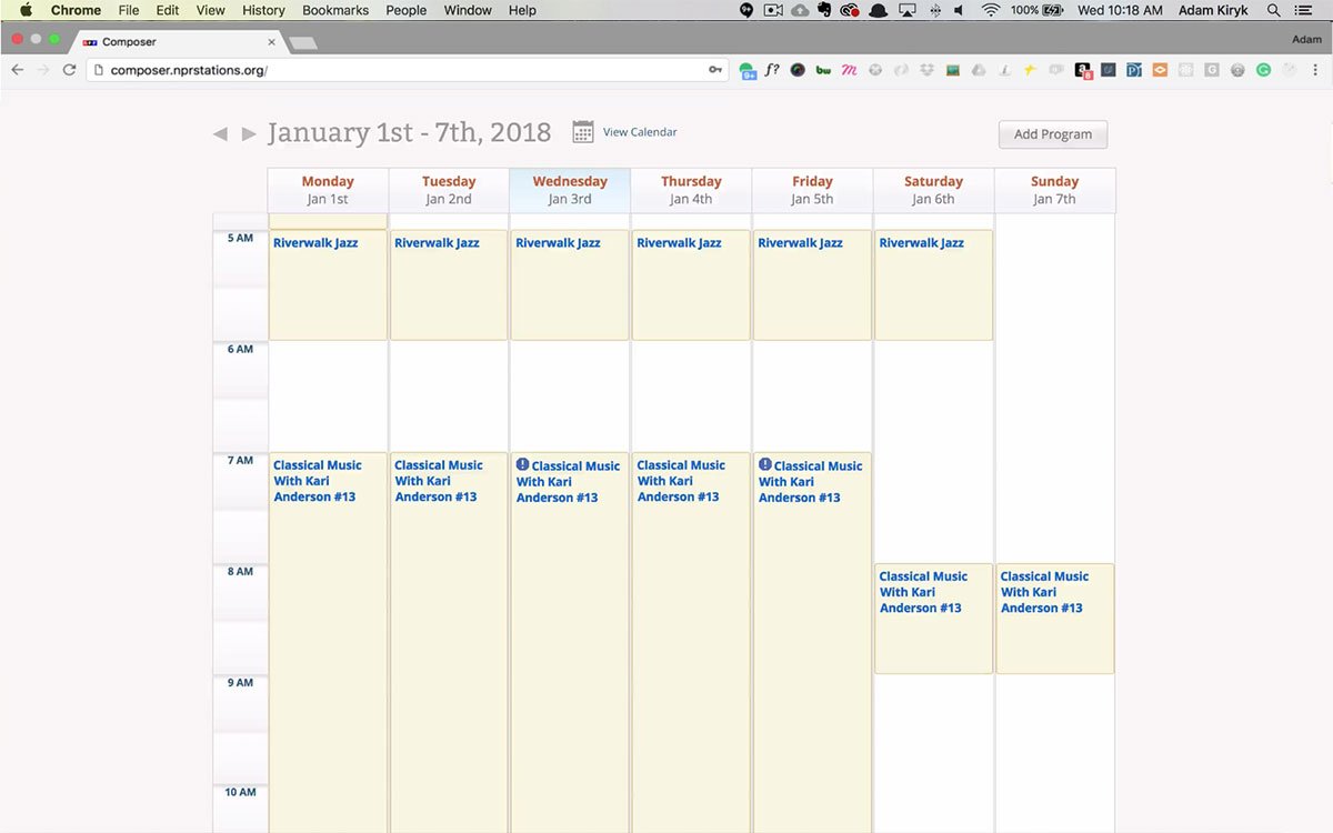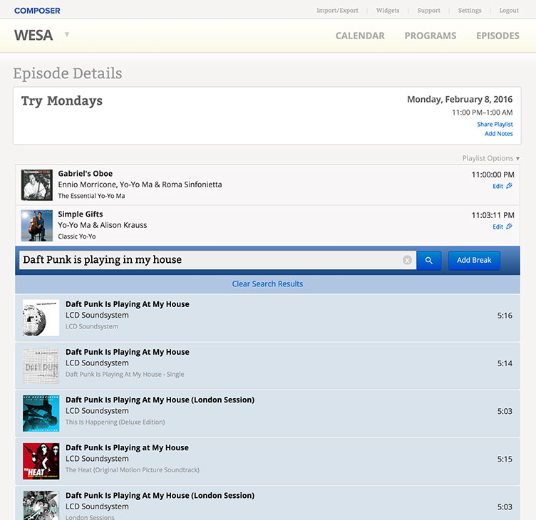 I implemented several features to the admin side of this application, including a typeahead search capability; a new interface for classical music stations; and a way to navigate through calendar views.