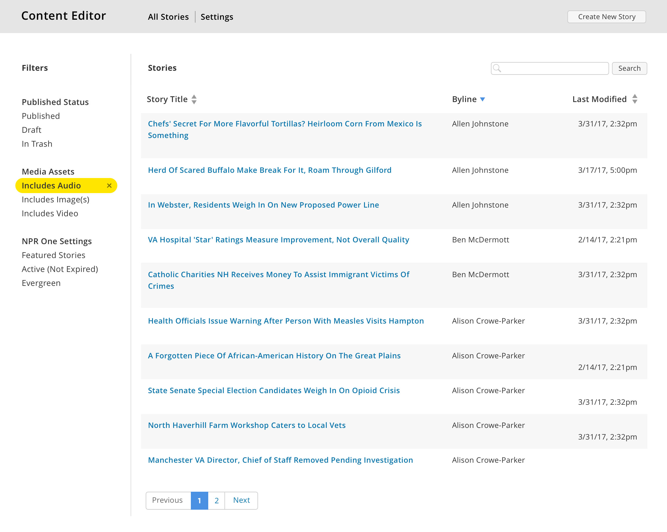 I created a simple and effective UI for displaying and finding stories, tested it with station users, and implemented it using React, Redux, and CSS modules.